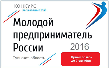 Вниманию молодых предпринимателей! Комитет Тульской области по предпринимательству и потребительскому рынку сообщает, что в настоящее время в г.Туле проводится региональный этап Всероссийского конкурса «Молодой предприниматель России – 2016». Цель данного Конкурса – выявление и поощрение активных и одаренных молодых предпринимателей, формирование позитивного образа молодежного предпринимательства, улучшение предпринимательской среды региона. |