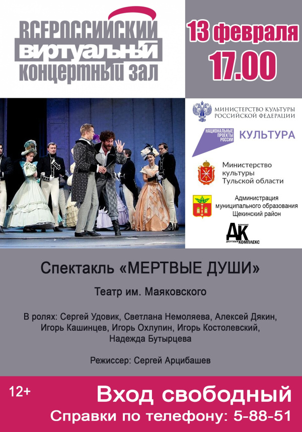 В 2024 году исполняется 185 лет одному из наиболее известных произведений Николая Васильевича Гоголя поэме «Мёртвые души». Виртуальный концертный зал Щекинского досугового комплекса приглашает на трансляцию спектакля Театра им.Маяковского.