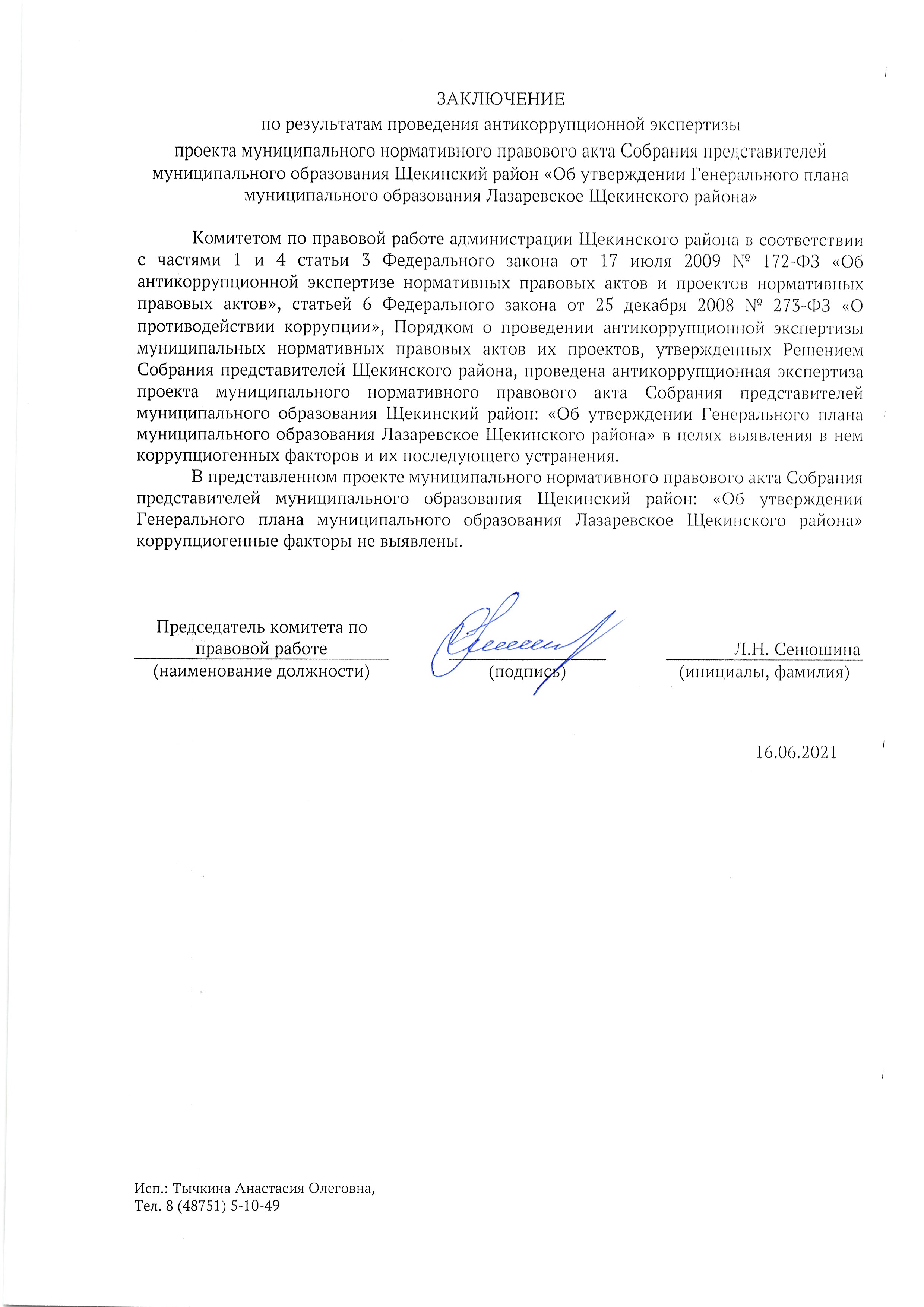 В соответствии со статьями 23, 24 Градостроительного кодекса Российской Федерации, статьей 14 Федерального закона от 06.10.2003 № 131 – ФЗ «Об общих принципах организации местного самоуправления в Российской Федерации», статьями 16 - 18 Закона Тульской области от 29.12.2006 № 785-ЗТО «О градостроительной деятельности в Тульской области», Уставом муниципального образования Щекинский район, учитывая заключения публичных слушаний от 16.03.2021, 17.03.2021, 19.03.2021, Собрание представителей муниципального образования Щекинский район, РЕШИЛО: 1. Утвердить Генеральный план муниципального образования Лазаревское Щекинского района в составе: 1.1. Положение о территориальном планировании (приложение 1); 1.2. Материалы по обоснованию генерального плана (приложение 2); 1.3. Карта планируемого размещения объектов местного значения поселения (приложение 3); 1.4. Карта границ населенных пунктов (в том числе границ образуемых населенных пунктов), входящих в состав поселения (приложение 4); 1.5. Карта функциональных зон поселения (приложение 5); 1.6. Карта существующих и строящихся объектов местного значения поселения (приложение 6); 1.7. Карта границ существующих населенных пунктов, входящих в состав поселения. Карта объектов культурного наследия. Карта границ лесничеств (приложение 7); 1.8. Карта зон с особыми условиями использования территории (приложение 8); 1.9. Карта территорий, подверженных риску возникновения чрезвычайных ситуаций природного и техногенного характера (приложение 9); 1.10. Сведения о границах населенных пунктов (в том числе границ образуемых населенных пунктов), входящих в состав поселения (приложение 10). 2. Признать утратившим силу решение Собрания представителей муниципального образования Щекинский район от 27.12.2018 № 6/69 «Об утверждении Генерального плана муниципального образования Лазаревское Щекинского района». 3. Опубликовать настоящие решение в информационном бюллетене «Щекинский муниципальный вестник» (http://npa-schekino.ru, регистрация в качестве сетевого издания: Эл № ФС 77-74320 от 19.11.2018) и разместить на официальном Портале муниципального образования Щекинский район. 4. Настоящее решение вступает в силу со дня его официального опубликования в средствах массовой информации.
